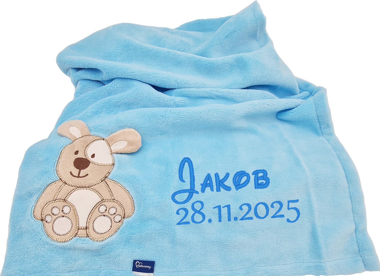 Personalisierte Decke in Hellblau mit Hundemotiv – mit Name und Geburtsdatum