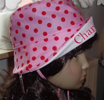 FuersBaby.de personalisierte Geschenke für Babys, Kinder und Erwachsene Kinderhut Mädchen rosa mit Punkten und Name bestickt, in leichtem Baumwollstoff, mit Bindebändern.