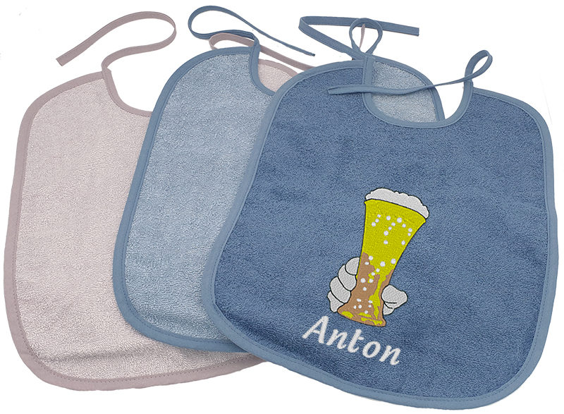 Das personalisierte Lätzchen für Erwachsene ist aus flauschiger Frottierware und wird am Hals gebunden. Ein einklemmen der Haare, wie bei Klettverschluss, ist somit nicht möglich.