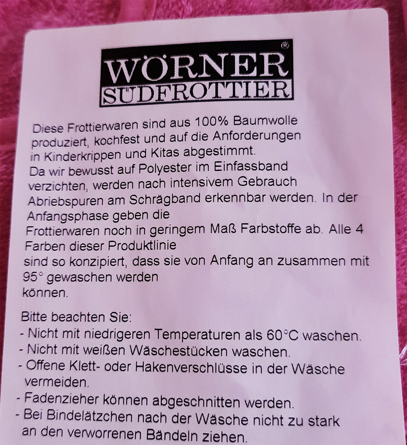 Die Lätzchen sind pflegeleicht, doch empfiehlt der Hersteller, sie ausschließlich mit Textilien gleicher Farbe und gemäß dem Pflegeetikett zu reinigen. Waschen Sie sie nicht heißer als empfohlen und auch nicht kälter; sonst kann die Farbintensität nachlassen und es können Flusen entstehen. Vermeiden Sie Kontakte von Haken- oder Klettverschlüssen mit der Frottierware.