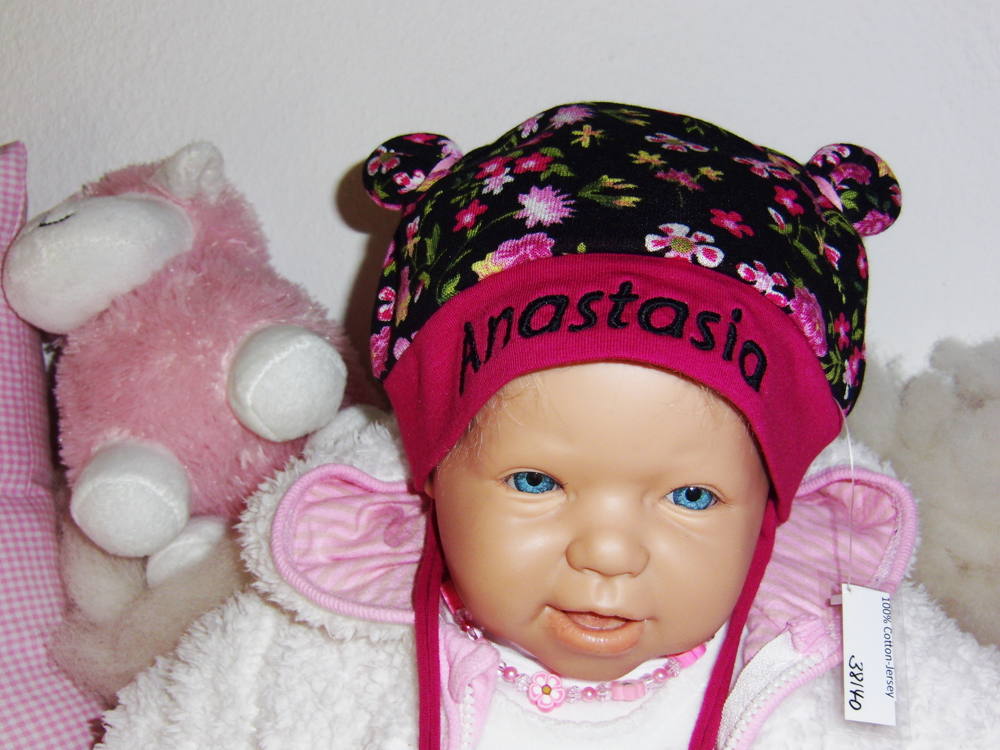 Wie wäre es mit der schwarze Mütze mit rosa-rosafarbenen Blumen? Mit der Namensbestickung ein tolles Unikat als Geschenk.