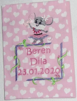 Jede U-Heft Hülle wird anders aussehen, denn Sie suchen selbst das vordere Stickmotiv (oder auch vorn und hinten) und die Schriftart (Druckbuchstaben oder Schreibschrift) aus.